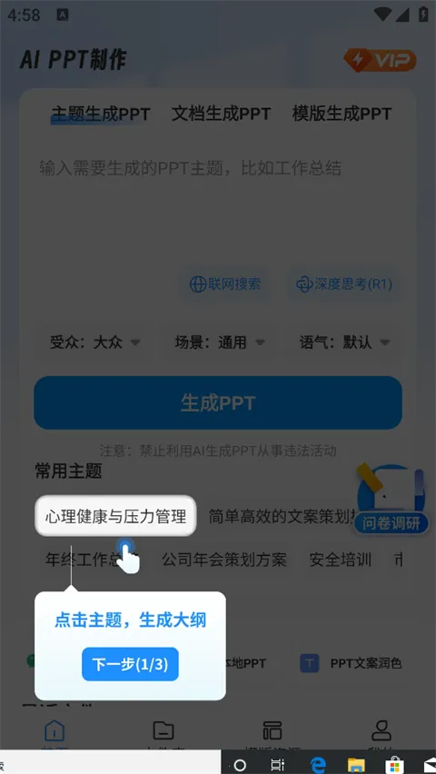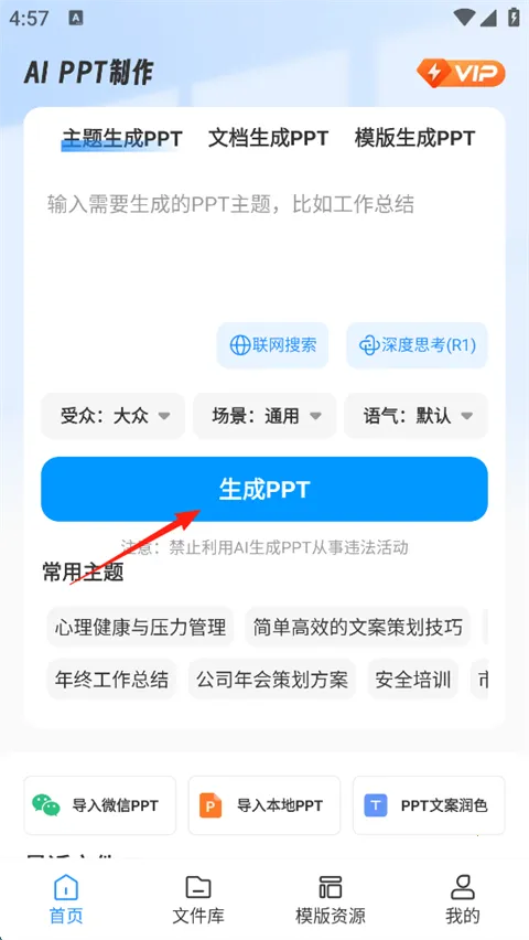 AiPPT制作师安卓版是智能PPT生成工具,借助AI技术,输入主题选素材就能一键生成。有海量模板素材库,兼容多种格式,适用于多场景。操作简单,能高效完成演示文稿,提升工作效率与表达质量,还不断优化用户体验。