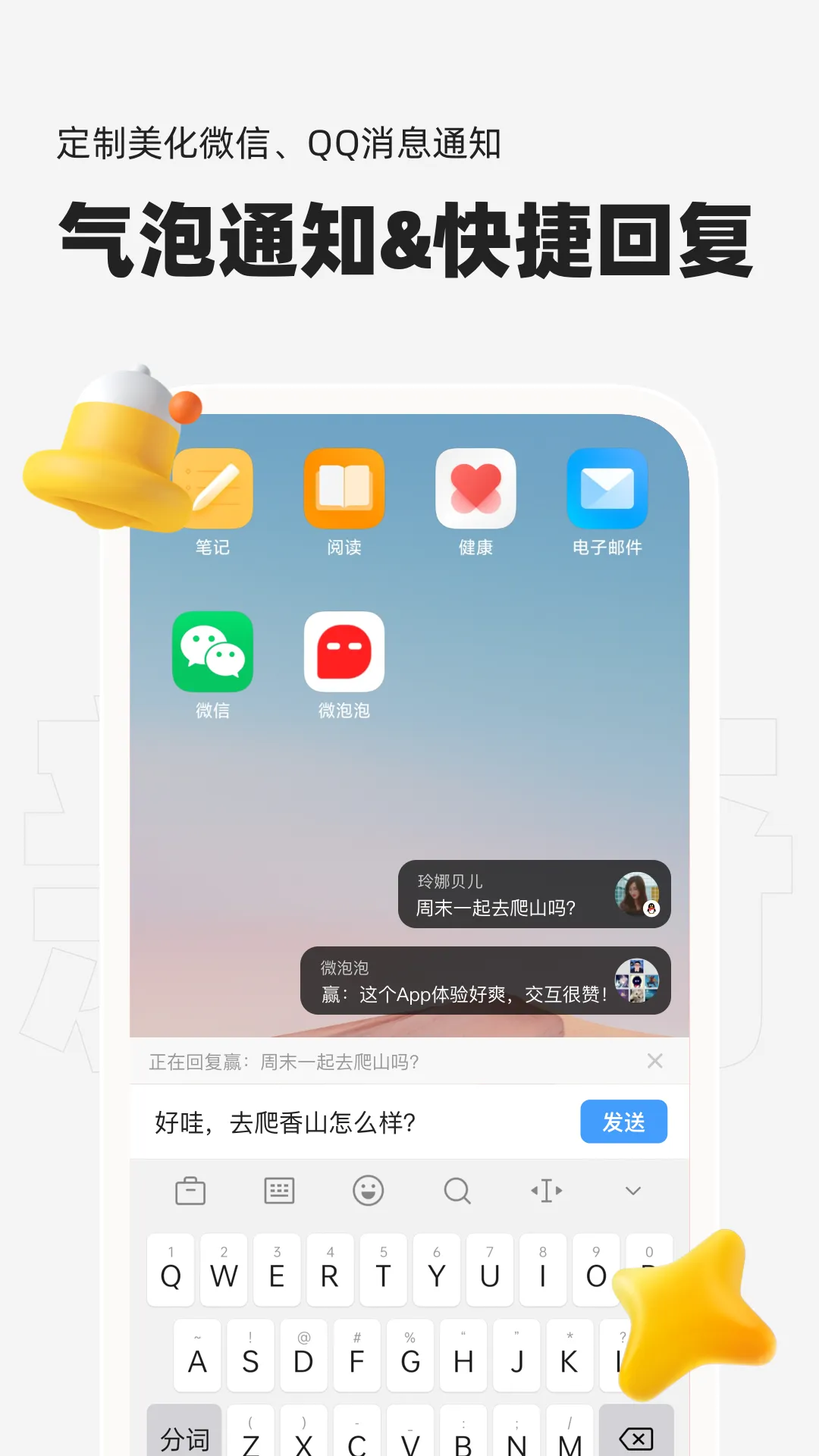 微泡泡由北京优友动量开发,是微信信息全局快捷回复工具。支持多场景快捷回复微信,有消息气泡、多样皮肤与快捷手势。还具备对讲机、霸屏聊天等功能,支持多媒体消息,能帮用户高效社交 。