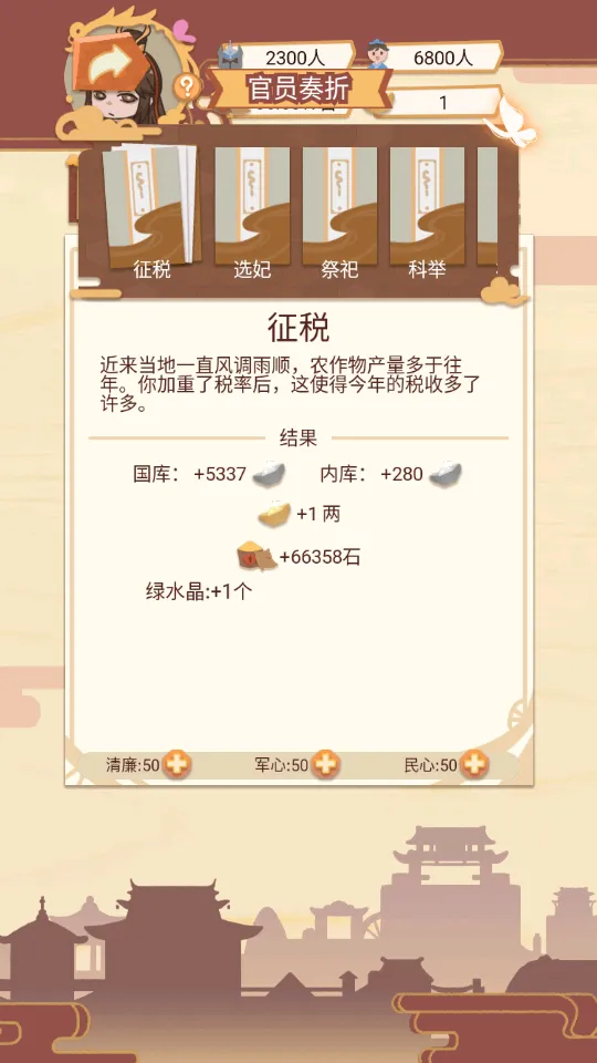 3、融入丰富历史背景,能选不同朝代皇帝角色,感受真实古代帝国管理。