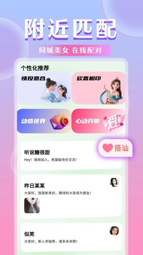 2、具备智能推荐功能,根据你的兴趣爱好推荐优质异性,还会自动刷新推荐列表和精彩动态,助力你邂逅心动之人。