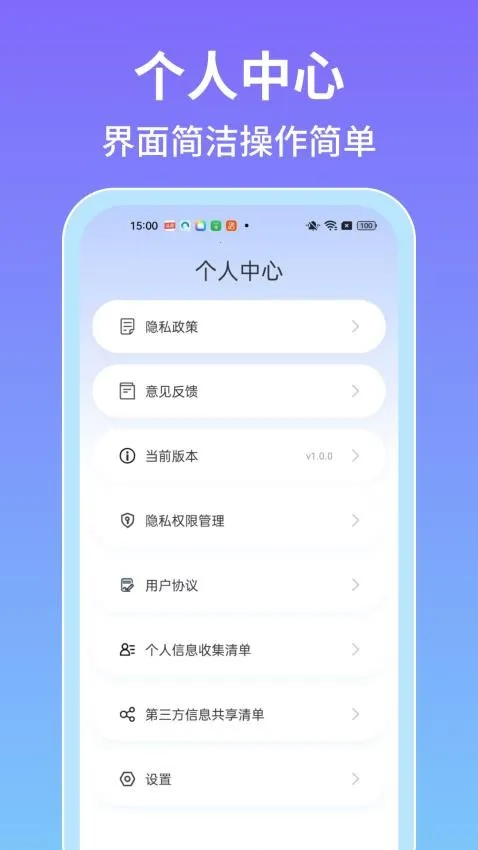 个人中心设计贴心,可随时查看隐私政策,反馈功能意见,助力平台及时优化问题功能,为用户提供更好体验。