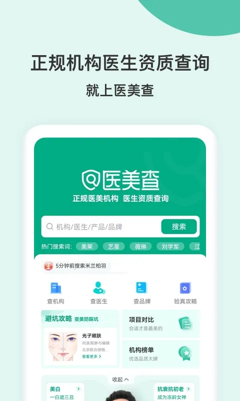 医美查2026最新版本是中整协互联网分会与新氧联合出品的权威医美整形查询软件。提供医疗机构与医生资质、舆情、口碑等查询,还有仪器药品验真、项目报价、避坑攻略等服务,助用户安心变美。