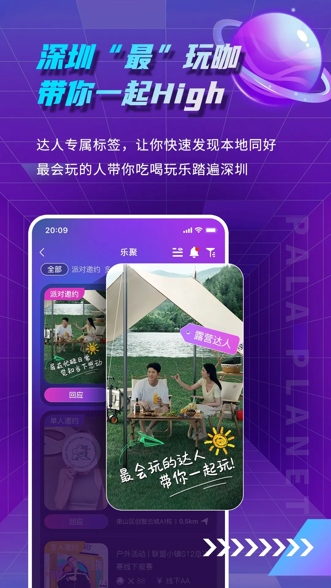2. 潮流玩法多:年轻人的团聚新生活,露营 party、脱口秀、飞盘、电音、BBQ 等潮流玩法持续更新,多种选择。