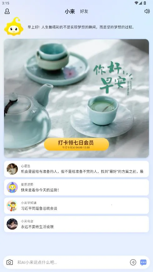 小来早晚安能帮你轻松设置起床时间,开启美好一天。它有强大的习惯追踪功能,能辅助建立稳定作息规律。界面简洁,操作流畅。每天会专属定制打卡图、问候语、节日壁纸等海量素材,一键分享至朋友圈超方便。还有做适合中国传统的万年历,提供公历农历、节日节气、当日宜忌、吉凶祸福、运势建议等实用功能,让生活管理更有序有趣。提供每天专属定制语音问候、天气贴心提示、好友陪伴打卡等关怀服务。早晚打卡能得积分换话费,看视频广告也有积分。还能学习睡眠小技巧,有情绪解压文章资讯。制定计划轻松,定时打卡避免延迟,能直观看到天气变化,每天还有励志语句激励你。快来下载小来早晚安,开启自律又美好的生活吧!