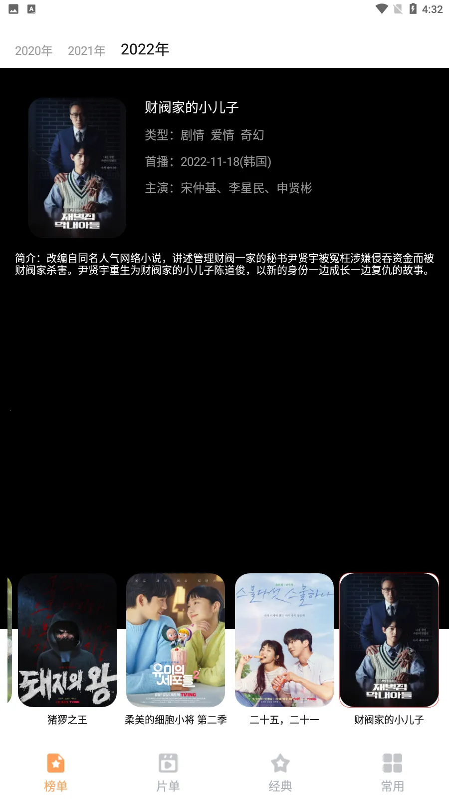 3. 提供丰富韩剧内容分类和选集,更新及时,操作简单,用户体验度高。