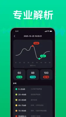 2、具备专业解析功能,通过图表展示噪音变化趋势,提供分贝等级参考。