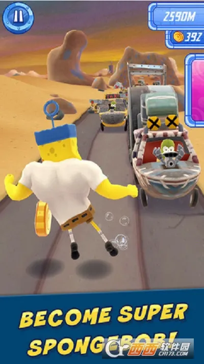 海绵宝宝跑跑海绵是款动作跑酷游戏,竞技模式有趣。画面精致,操作简单,新手易上手。能给角色换服饰,通过滑动屏幕控制移动、跳跃等,还有无尽模式,沿途有好友加油或痞老板阻拦,可解锁服装与能力。